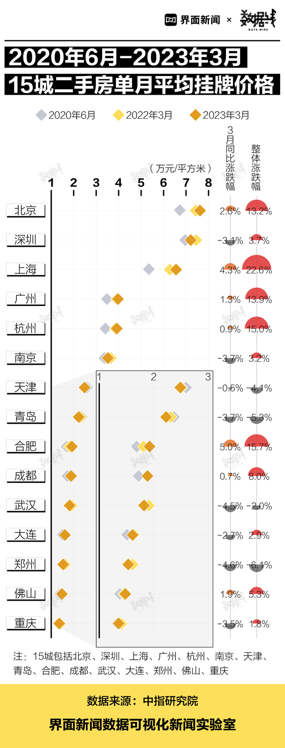 主要城市二手房挂牌价降了,但近3年仍呈上涨趋势。中指研究院监测的15城二手房平均挂牌价格显示,2023年3月,15城中有8城二手房价同比下跌,15城平均下降0.6%。但从近3年数据来看,2020年6月至2023年3月,15城中有11城二手房价上涨,15城平均涨幅为5.9%。