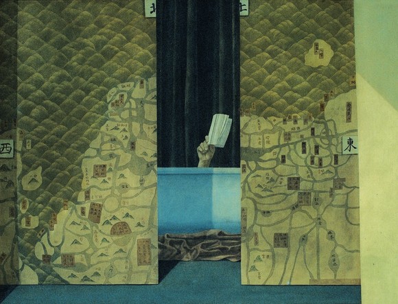徐累的早期作品有强烈的戏剧性。帷幔、纱帐和呈45度角折叠、模仿明代版画透视规则的屏风和围墙在画面中勾勒出状似舞台的背景,人、马、蝴蝶、鹿、帽子、椅子或假山在他的画作中频繁出现,却往往难窥全貌——白衣男子用书遮住了脸,被屏风挡住上半身,或堪堪露出一只手;马从帷幔后探出头;鹿的角上挂着一顶帽子。更让人迷惑但又被深深吸引的是作品流露出的神秘和悬疑感。艺术家描绘的人物或物品都再现实合理不过,但它们被放置在一个奇异的环境中,在真实与虚假的交界处暧昧不清。徐累有时会直接在画面中明示虚假,比如将地图中的地名替换成取自地理学之外其他语境的名称。
