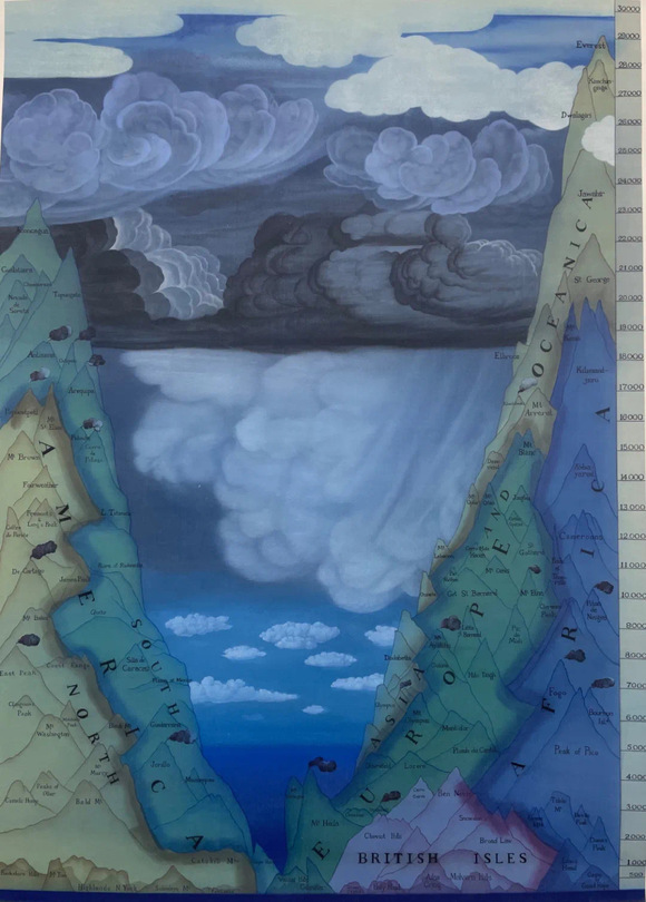 在近年来的作品中,徐累开启了对时间的另一种体悟,“时间是可以随意搭配和自由穿梭的。”“共生-时间的折叠”单元集中展示了徐累如何在作品中整理自己从全球艺术史中汲取的视觉元素、绘画技巧和美学影响,将之组合、并置、互嵌,甚至到了某种令观者吃惊的地步。他根据19世纪科学数据图“世界主要山脉和河流图”创作了《世界的云和山》,按照高度排列的山峦被覆上不同的色块,用以标识各大洲和英伦群岛;画中的云也不是自然的云,而是从日本画、印度画、中世纪欧洲绘画、和宋画中撷取的云,表现出世界文明的层峦叠嶂。《鹊华异色图》中,赵孟頫的《鹊华秋色》与北方文艺复兴怪杰博斯的《人间乐园》交织在一起,碰撞出奇特的火花。