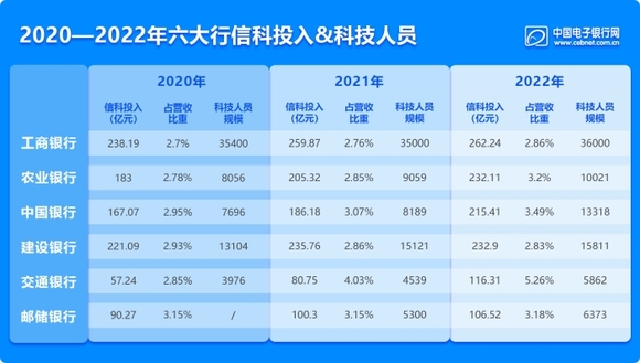 中国电子银行网梳理财报发现,2022年工商银行信科投入262.24亿元,同比增0.91%,连续三年领跑;第二名则是建设银行,信科投入232.9亿元;第三名农业银行信科投入232.11亿元;中国银行2022年信科投入215.41亿元,排名第四;交通银行和邮储银行信科投入分别为116.31亿元和106.52亿元。值得一提的是,交通银行2022年信科投入在六大行中增幅最高,同比增幅高达32.93%,且是六大行中唯一一家信科投入占营收比重超5%的银行。