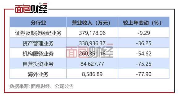 其中,证券及期货经纪业务实现收入37.92亿元,同比下降9.29%;资产管理业务实现收入33.89亿元,同比下降36.25%;机构服务业务实现收入26.04亿元,同比下降54.62%;自营投资业务实现收入8.46亿元,同比下降75.25%;海外业务实现收入0.86亿元,同比下降77.90%。
