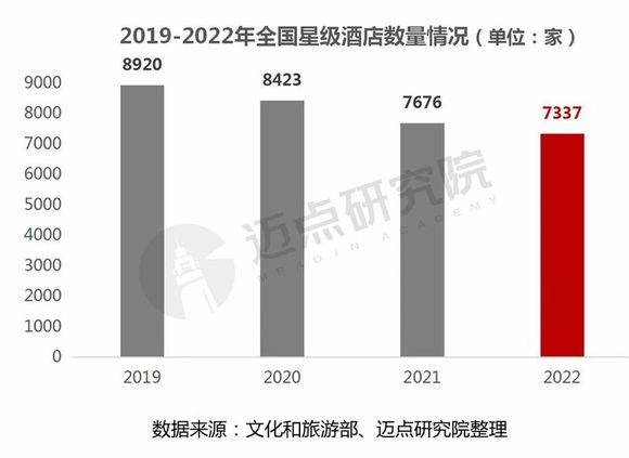 从星级酒店数量分析,2022年全国共经营星级酒店7337家,比上年减少339家,同比减少4.42%。