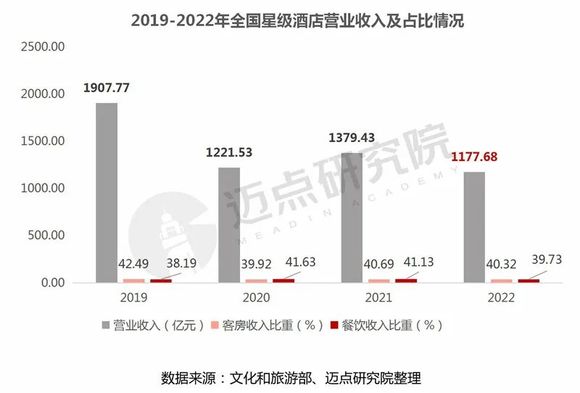 对比2019-2022年全国星级酒店营业收入数据:除2021年同比有一定增长外,整体呈下滑趋势。从餐饮收入和客房收入占比情况看,2019年以后,餐饮收入占比有一定幅度提升,客房收入占比则相对下降,这同疫情期间酒店适应形势经营模式调整变化相关,即挖掘本地居民生活服务市场,开展餐饮外卖、预制菜等业务。