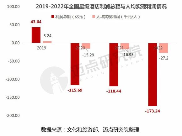2022年全国星级酒店利润总额-173.24亿元,依然处于亏损状态,且亏损额度较2021年有所扩大,亏损同比增加54.8亿元。对比2019-2022年的利润总额,可知自2020年开始,全国星级酒店利润总额即开启“亏损”模式,且亏损额逐年增加,2022年亏损额高达170余亿元。进一步从人均实现利润指标情况看,2022年全国星级酒店人均实现利润-27.2千元/人,表明人均亏损2.72万元,且这一指标自2020年开始呈现逐步增加态势。