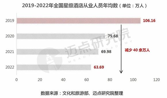 从业人员年均数情况:酒店业属于劳动密集型产业,且服务特性决定了人员接触多,因而受“口罩”因素最为直接深刻。全国星级酒店从业人员自2019年至2022年四年间,减少额高达约42万人,从业人员数量骤降。一方面,酒店企业在无法营业、经营承压的情况下,裁员压缩成本;另一方面,员工出于安全、压力的因素考虑,行业发展信心受挫,主动离职。