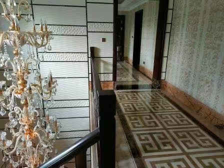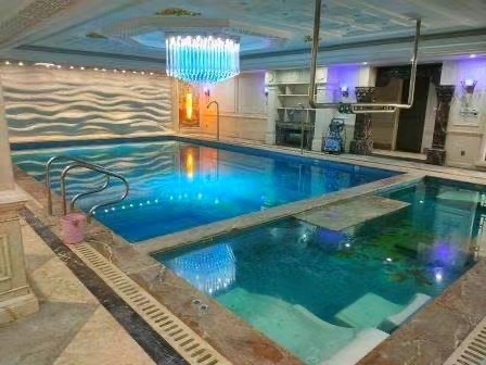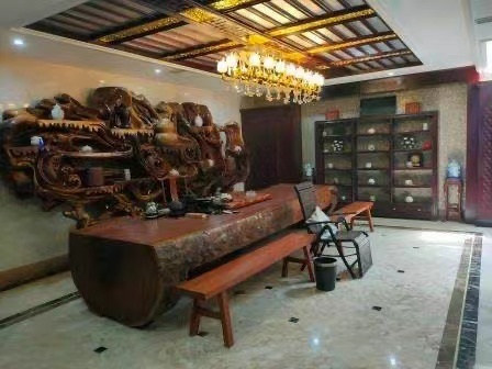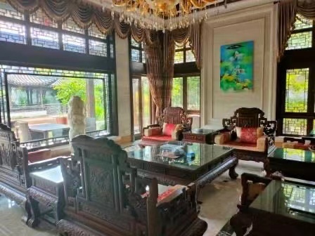 比如屋内是200吨纯红木中式精装修,客厅七彩琉璃玄关屏风、整套定制红木家具及红木根雕茶桌茶椅等;餐厅3套红酸枝餐桌椅及红木格子架等;卧室衣帽间及书房全红木定制家具,墙面刺绣墙纸;厨房、卫生间地面铺设大理石,墙面铺设玉石;地下室标准尺寸游泳池、酒窖、桑拿房、健身房、7米红木老茶台、bose家庭影院。