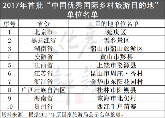 据文化产业评论(ID:whcypl)考证,早在2017年8月,原国家旅游就局曾对外发布了首批“中国优秀国际乡村旅游目的地”名单,此次全国共有10个目的地入选,分别是北京延庆区、黑龙江雪乡、湖南韶山旅游区、江西婺源县、广西阳朔、江苏周庄香村、浙江东阳花园村、安徽黟县、海南北仍村、贵州西江千户苗寨。