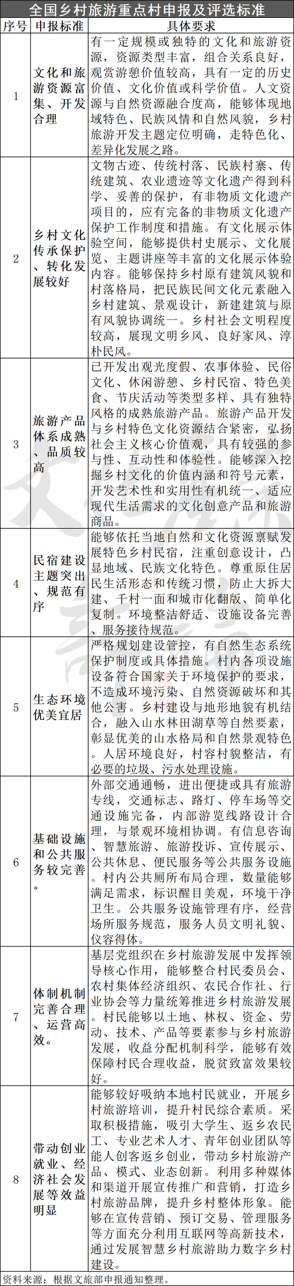 一个“前置条件”就是,推荐满足以下九项具体要求的全国乡村旅游重点村参与遴选。主要包括文化和自然资源优越;文化资源传承传播基础好;旅游业发展具有优势;旅游业促进当地经济可持续发展情况好;旅游业促进当地社会可持续发展情况好;旅游业促进当地生态可持续发展情况好;旅游业战略定位和规划管理水平较高;基础设施完善,互联互通水平高;应急管理保障措施健全等。