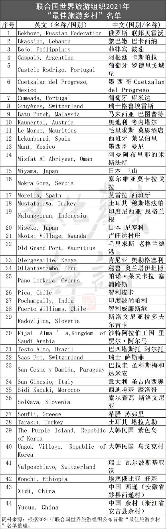 2021年5月,联合国世界旅游组织开展了首批评选工作。75个联合国世界旅游组织成员国积极响应,共提交了174个村庄作为候选。经过资深专家层层筛选,最终来自32个国家的44个村庄脱颖而出,荣膺联合国世界旅游组织“最佳旅游乡村”的殊荣。其中,来自中国的浙江余村和安徽西递村成功入选。