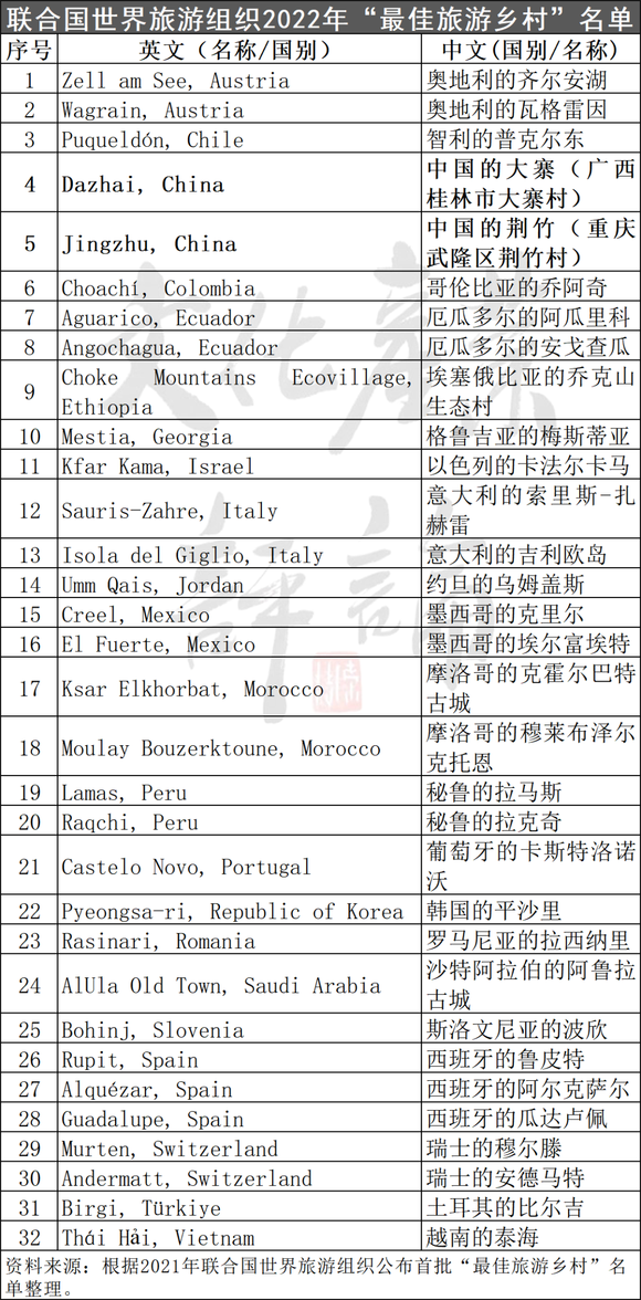 2022年12月20日晚,联合国世界旅游组织正式公布第二批“最佳旅游乡村”名单。此次评选共有来自57个国家的136个乡村参加角逐,最终32个乡村获此殊荣。其中,中国的广西大寨村和重庆荆竹村榜上有名。至此,我国已有4个乡村被授予世界“最佳旅游乡村”称号,总量居亚太第一、世界第三,标志着中国乡村在讲述中国故事、开展文明互鉴方面迈出了新的步伐。