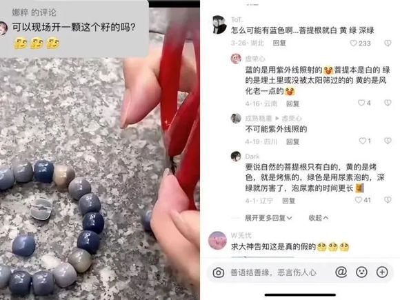 这边的博主说,你看我家这个珠子,不染色的,直播拿锤子砸开给你们看;那边博主科普说,现在的染色工艺早就可以染到里面了。