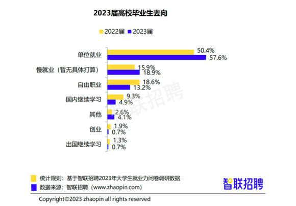调查显示,在接受调查的2023届毕业生中,选择单位就业的比例从去年的50.4%上升到57.6%,慢就业比例也从去年的15.9%上升到18.9%。与此同时,选择自由职业的比例从去年的18.6%下降到13.2%,选择在国内继续学习的比例从去年的9.3%下降到4.9%。
