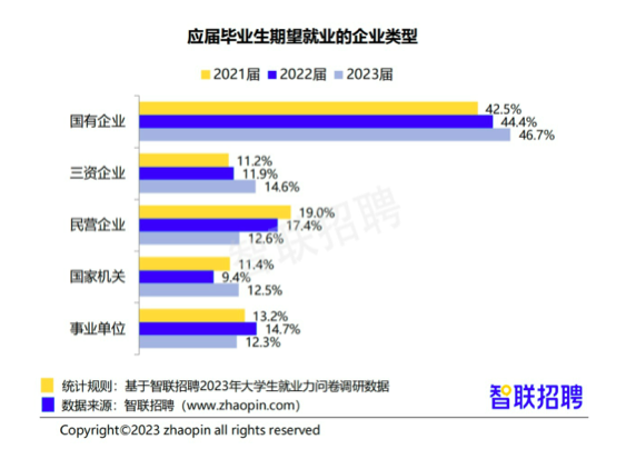 从求职的企业类型看,2023届毕业生求职时的求稳心态有增无减,国企仍是首选,对民企的兴趣则持续回落。46.7%的应届毕业生求职时倾向于国有企业,较去年上升2.3个百分点,且连续三年呈上升态势。选择民营企业的占比12.6%,较去年下降4.8个百分点,连续三年呈下降态势。