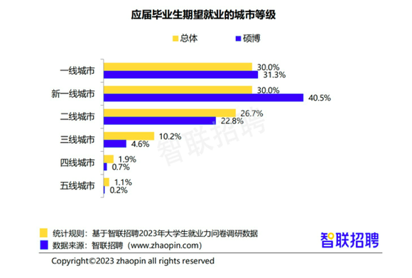 从毕业生期望的就业城市来看,一线及新一线占比均为30%,二、三线分别占比26.7%、10.2%,四、五线占比则均不足2%。分学历来看,硕博毕业生对新一线的偏好更明显,占比40.5%,较偏好一线的占比高出9.2个百分点,且高于总体10.5个百分点。