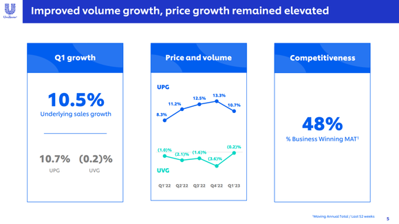 联合利华表示,在战略重点取得进展的推动下,一季度基本销售额的增长加速至10.5%,价格增长保持在10.7% 的高位,销量表现环比改善至下滑0.2%。
