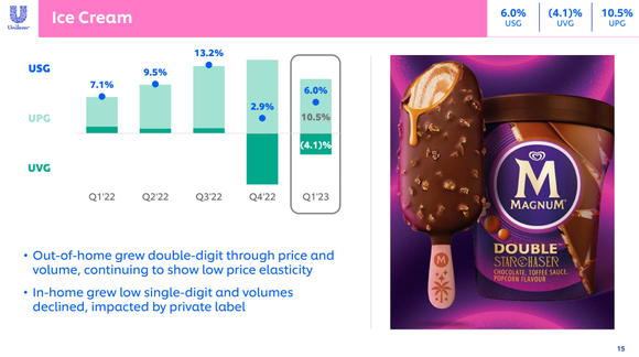 “居家冰淇淋实现低个位数增长,但销量有所下降,因为在严重通货膨胀的环境中,该品类的非必需品性质仍然影响到各地区的消费。而户外冰淇淋则实现双位数增长,价格和销量均有所上涨,冰淇淋旺季如期而至。”联合利华表示。