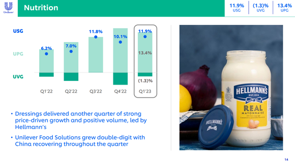 他又指出,在好乐门(Hellmann’s)的带动下,调味品实现了又一季度的增长,主要由强劲的价格驱动,同时销量也有所上涨。好立克(Horlicks)恢复了增长,但销量继续在一定程度上受制于印度农村消费者面临的通胀压力。