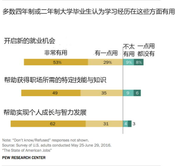 尽管如此,美国人对大学教育意味着什么、究竟有没有用这些问题并没有达成普遍共识。