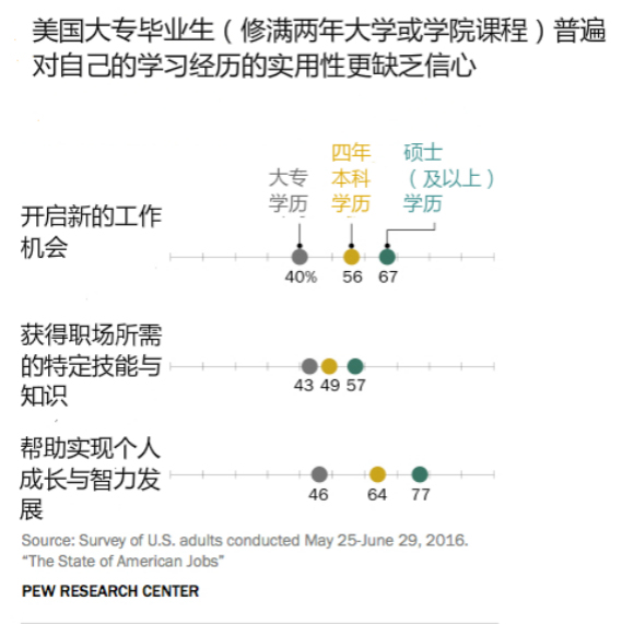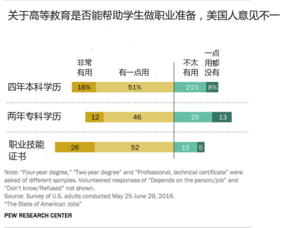 然而,当研究人员就大学教育对职业发展的影响询问更宽泛的问题时,公众的态度不一。尽管67%的美国人认为传统四年制大学学历对学生在当下找到一份薪酬体面的工作多少有帮助,只有16%的人认为大学学历非常有帮助,另外29%的人认为这不能很好地为学生做求职准备。