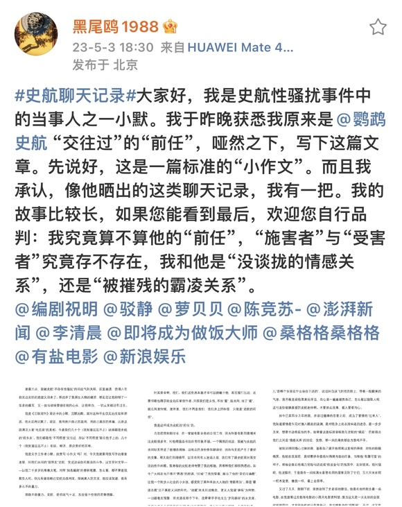 本次的性骚扰事件不断发酵,史航试图以聊天记录截图证明这是男女双方的“你情我愿”。另一方面,越来越多女性正鼓起勇气站出来讲述自身遭遇。史航性骚扰事件当事人之一小默5月3日发出的文章就是力证,她具体而有力地回忆了自己受到侵害的事实、过程与感受。