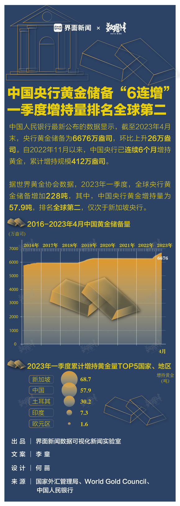 数据 | 中国央行黄金储备“6连增”,一季度增持量排名全球第二