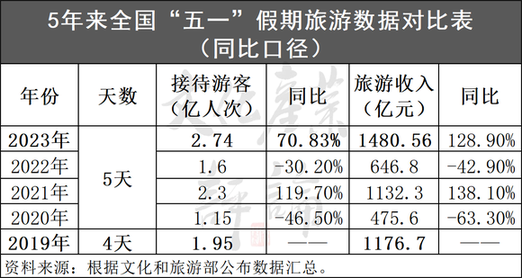 据文旅部数据中心测算,“五一”假期全五天,全国国内旅游人次总计达到2.74亿人次,同比去年同期增长了70.83%;而按照可比口径计算,这一数字恢复至了疫前同期的119.09%。实现国内旅游收入达到1480.56亿元,与比去年同期相比增长了128.90%;按照可比口径计算,已经恢复至了疫情前同期的100.66%。(请参考我们近期推文《重磅|2.74亿人次出游,五一假日旅游5年数据大揭秘》)。