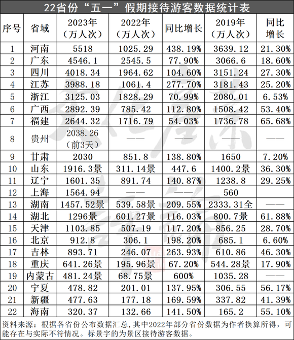 截至5月4日17时,全国已有22个省份陆续公布2023年“五一”假期文旅市场相关数据。以省域公布的数据为对比尺度,全国重点旅游省份的接待游客数量已经回到2019年同期水平。其中,河南、广东、四川、江苏、浙江、山东等省份增长态势较为强劲,创近年历史新高。