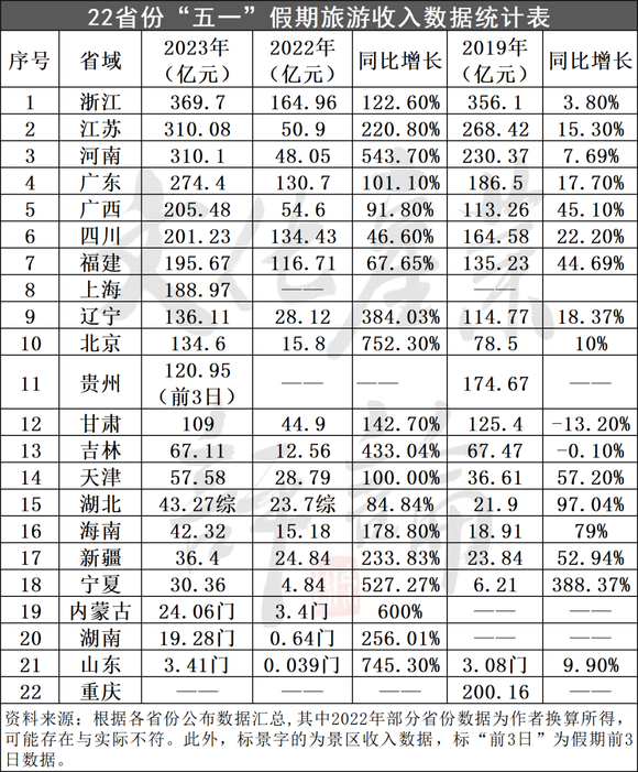 分别是浙江(369.7亿元)、江苏(310.08亿元)、河南(310.1亿元)。其中,浙江省5天假期吸金369.7亿元,较2022年同比增长122.6%,较2019年同期增长3.8%,堪称全国省域的“吸金王”。