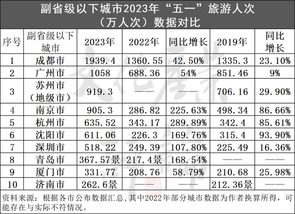 据中国旅游研究院专项监测显示,今年“五一”假期,副省级以下城市中,成都、广州、西安、武汉、深圳、杭州、长沙、郑州、南京和苏州等10城接待游客人数占全国游客总人数的16.37%,且多项指标提升明显。鉴于数据不齐,以下分析以可见公布数据为准。