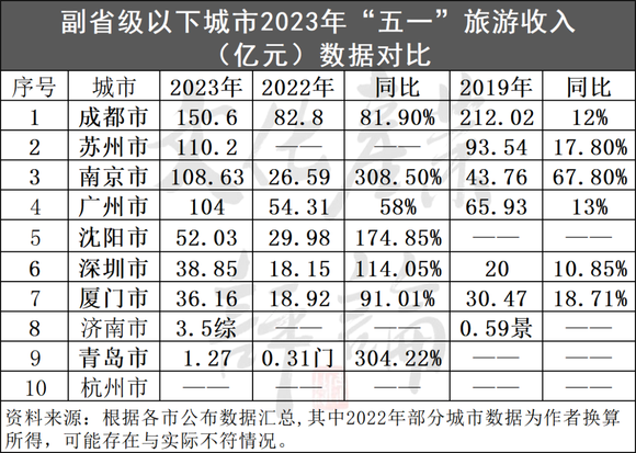 其中,收入排在副省级以下城首位是成都市。公布数据显示,成都市在“五一”假期实现了超过150.6亿元的旅游总收入,同比去年增长了81.9%,较2019年增长了12%(增长率高于全国11个百分点)。此外,全市A级旅游景区的门票收入8153.5万元,较2019年增长了12.8%。这些数据表明成都旅游业强劲的发展势头。