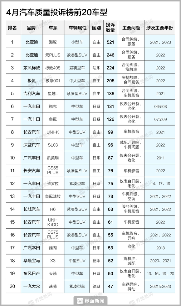 需要注意的是,锐志、皇冠、凯美瑞和卡罗拉四款车型上榜车型年份均较久远,因而投诉内容也较为接近——仪表台开裂、部件老化、转向系统异响等问题为上述四款车的普遍问题;皇冠路放则依旧没有解决界面新闻此前曾报道的车机影音系统升级问题及空调问题。