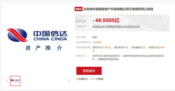 该笔债权总额为46.95亿,处置主体是中国信达,但并非是竞价拍卖,而是招商的资产推介。