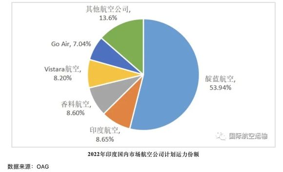 全球航旅数据提供商OAG数据显示,2022年印度国内市场航空公司计划运力份额中,靛蓝航空以53.94%排名第一,捷行航空以7.04%排名第五,中间三位分别是印度航空、香料航空、Vistara航空。