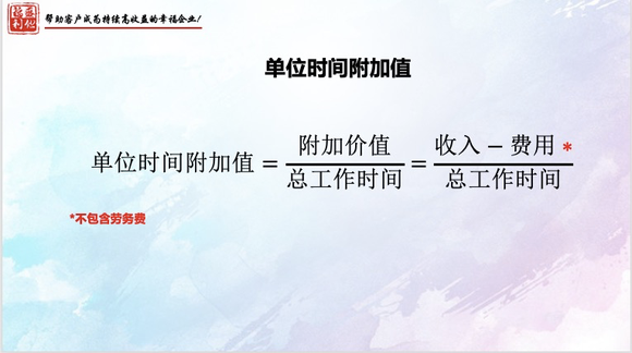 单位时间附加值这一指标中有两个概念:一个是效率,一个是时间。任何一个员工,任何一个部门做任何一项工作的时候,都要考虑这项工作短、中、长期是否有利于提升单位时间附加值?否则,就没有必要去做。这一指标,可以让贡献的真相清晰地呈现出来。
