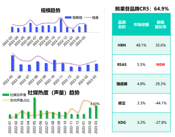 值得关注的是,HBN为熊果苷相关产品的绝对头部品牌,市占率是第二名的接近十倍,且在市场份额高达48.1%的情况下,还保持了35.6%的高增长率。市占率排名第三的薇诺娜也有29.3%的增长。就社媒热度而言,熊果苷产品的声量在微博、抖音、小红书等主流社媒平台持续增长,同比上涨高达37%。