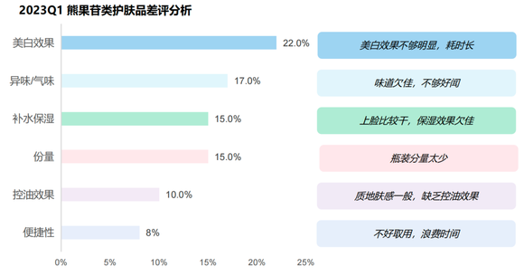 据魔镜市场情报分析结果显示,在熊果苷类护肤品的消费者需求中,美白效果仍然是消费者关心的重中之重,但是大部分产品美白效果不明显、耗时长和祛斑提亮功效差的问题,加之味道不够好闻、补水效果较弱,会影响消费者购买。此外,小瓶装容量也让消费者觉得性价比不高,需要长时间、高频次购买。