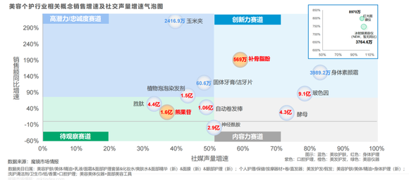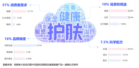 其一,消费者对医美带来的肌肤健康认知较深,拥有较高的信任,与“医美”属性紧紧绑定,提及率比较高的品牌,如华熙生物等拥有较强医美背景的企业更受欢迎了。