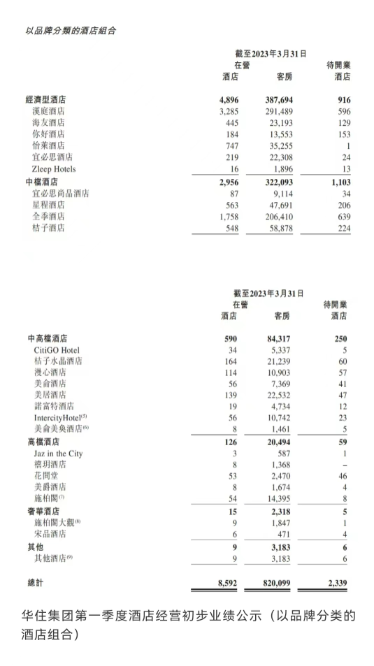 截至今年一季度,华住及旗下其他酒店数目共8592家,其中经济型酒店4896家、中档酒店2956家、中高档酒店590家、高档酒店126家、奢华酒店及其他24家;待开业酒店数目2339,其中经济型酒店916家,中档酒店1103家,中高档酒店250家,高档酒店59家,奢华及其他11家。