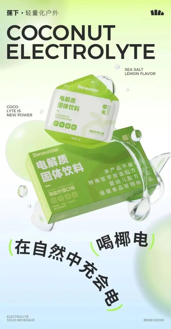 当下炙手可热的国内防晒品牌「蕉下」也在2023年4月推出了一款功能性食品——椰电电解质粉,椰子这一元素真的是香饽饽。