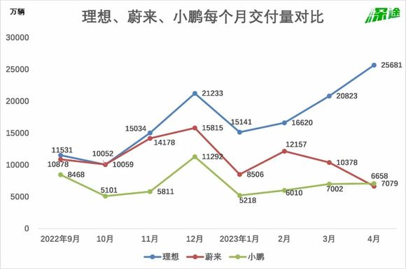 今年过去4个月,理想平均月交付量大约2万,蔚来接近1万,小鹏是6000多,这个差距接下来还会持续。