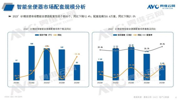 从精装市场一级配套卫浴部品来看,2023年一季度精装修市场普通坐便器配套项目个数212个,配套规模为13.4万套,配置率达到94%;花洒、洗面盆及浴室柜配套规模均在14.2万套左右,配置率均接近满配;智能坐便器配套项目个数85个,配套规模为5.6万套,配置率达到39.2%;淋浴屏配套项目个数170个,配套规模为11万套,配置率达到77.3%;浴霸配套项目个数173个,配套规模为11.6万套,配置率达到80.9%,整体来看卫浴各部品配置率同比去年均有不同程度的提升,其中智能坐便器增长最为明显,配置率同比+9.8%,各卫浴部品规模一季度环比也均随大盘向上浮动。(戳→奥维数据罗盘)
