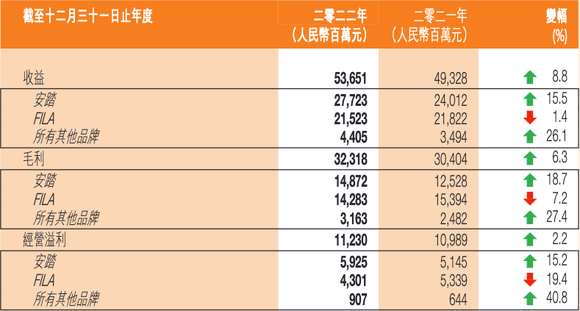 安踏主品牌的表现并不亮眼。2022年安踏主品牌收入同比增长15.5%,横向来看,李宁2022年收入同比增长也达到了14.3%。
