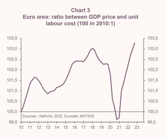 考虑到能源等大宗商品价格如此高昂,欧元区企业利润率仍在攀升这一点着实令人倾佩。当然,企业利润率的攀升也导致了2023年初欧元区通胀率的激增(近两个百分点)。这一现状表明,想让通胀放缓绝非易事,因为通胀会带来工资的进一步上涨,而企业利润率的“追赶效应”也将进一步凸显。