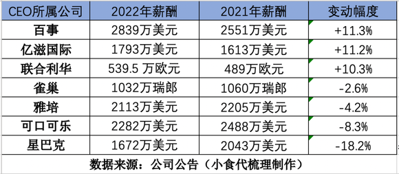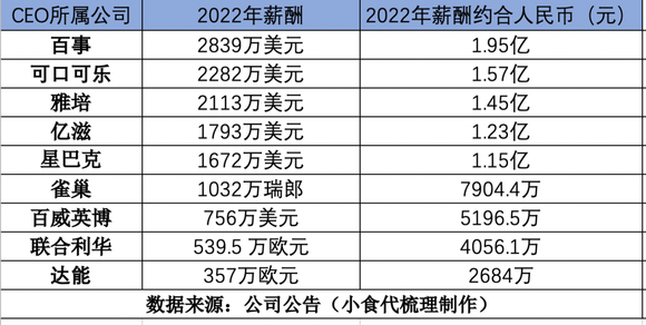 近日,小食代根据《财富》2022年世界500强名单,梳理了其中的外资食品饮料CEO薪酬排行榜。这份榜单不仅涵盖了主营包装食品饮料的百事、可口可乐、亿滋、雀巢、百威、达能,还包括和路雪、家乐等一众知名品牌背后的联合利华,靠营养品收入500多亿的雅培,以及全球最大咖啡连锁星巴克。