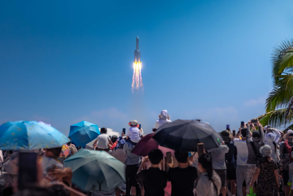 火箭发射的隆隆巨响与人群的喧嚣席卷了整片沙滩。人们的视线齐齐越过一片海域,投向几公里外的双塔型建筑之间。文昌航天发射场是世界上为数不多的低纬度发射场之一,也是我国首个开放性滨海航天发射基地。
