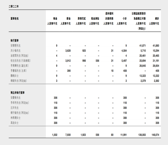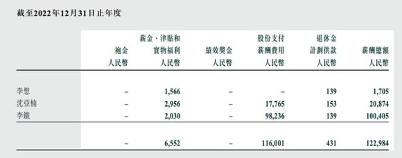 另一位核心人物——理想汽车前总裁沈亚楠薪酬2087.4万元,相较2021年的8750万大幅缩水。2022年9月,港交所文件显示,沈亚楠两天内抛售100万股股票,套现金额超9000万元,以此计算,他在2022年的收益也超过1亿元。2022年12月,沈亚楠宣布离职。
