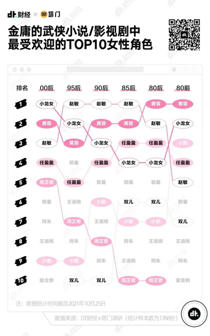 “黄蓉”在金庸笔下的女性角色中的受欢迎程度也排行前列。根据DT财经的统计,在金庸最受欢迎女性角色TOP10里,“黄蓉”是唯一一个在全年龄段都排进前三的角色。