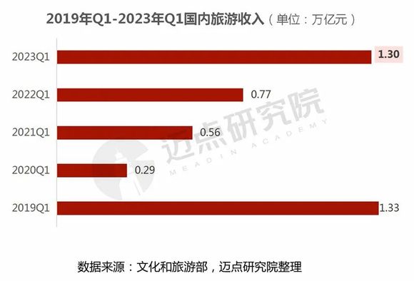 国内旅游收入情况:一季度,国内旅游收入(旅游总花费)1.30万亿元,比上年增加0.53万亿元,增长69.5%。其中,城镇居民出游花费1.12万亿元,同比增长79.5%;农村居民出游花费0.18万亿元,同比增长26.1%。