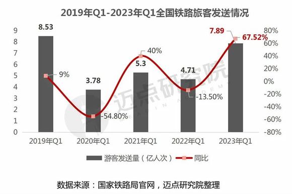 对比2019-2023年Q1数据可知:2023年Q1国家铁路客运量是2020年以来最高,但仍没有达到2019年同期水平。2019年一季度国家铁路客运量达到8.53亿人,当前客运量为2019年的92.5%。