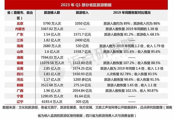 据迈点研究院不完全统计,有15个省(直辖市、自治区)公布了一季度的旅游数据情况。从与2019年同期情况相比,各省区旅游人数和旅游收入整体恢复情况良好,具体来说:人数恢复优于收入,如以内蒙古、山东、福建、云南等为代表,旅游人数已超2019年同期水平;旅游收入普遍恢复至2019年同期的80%及以上。